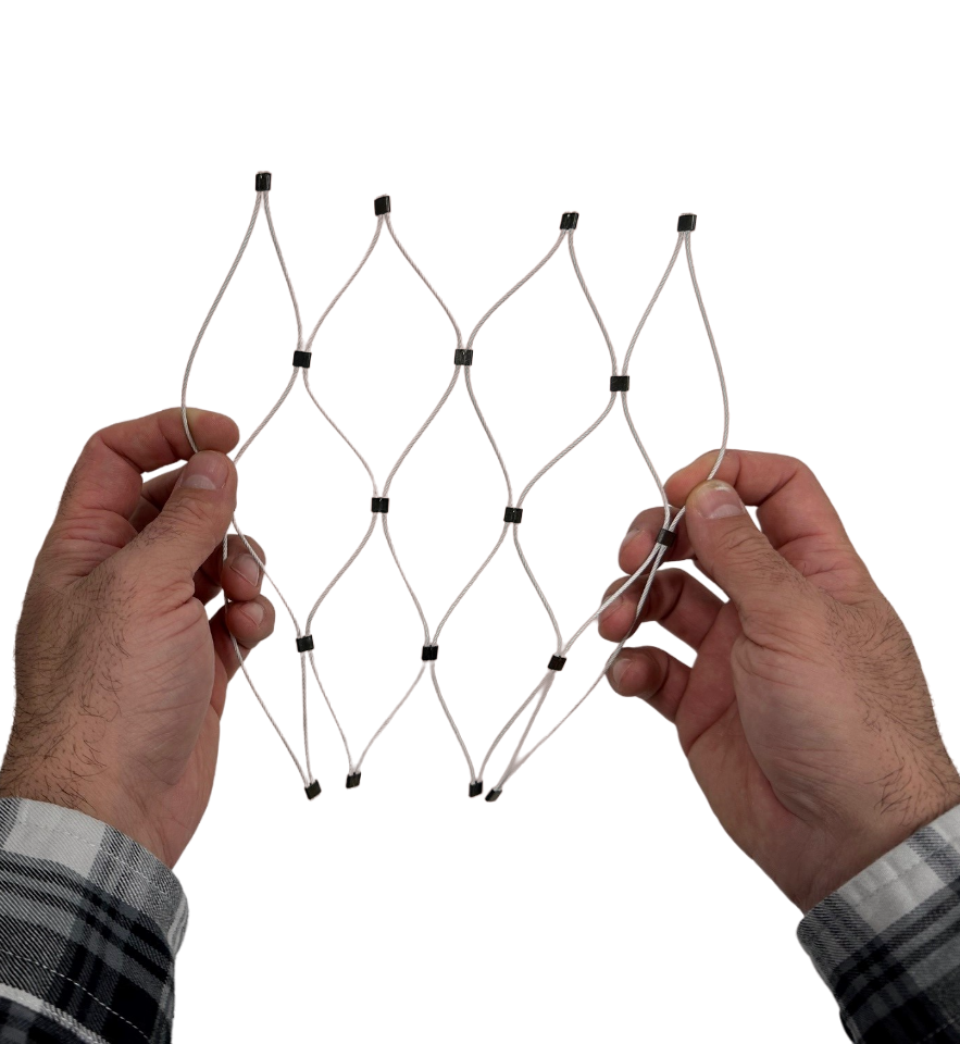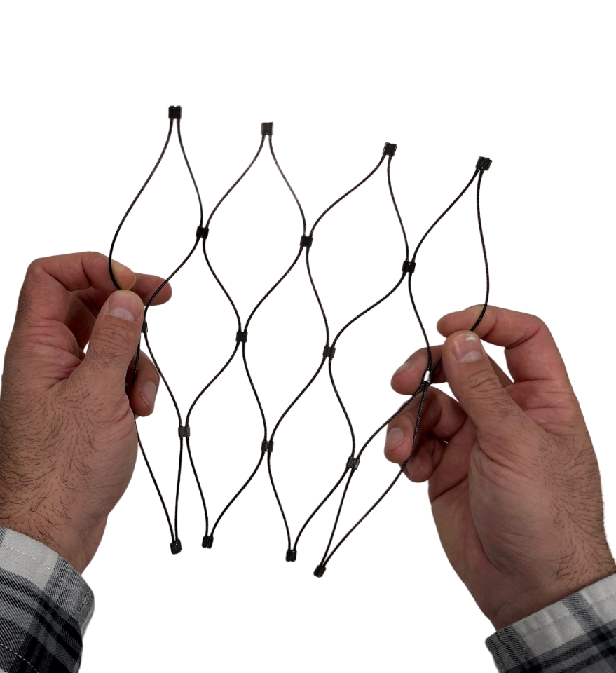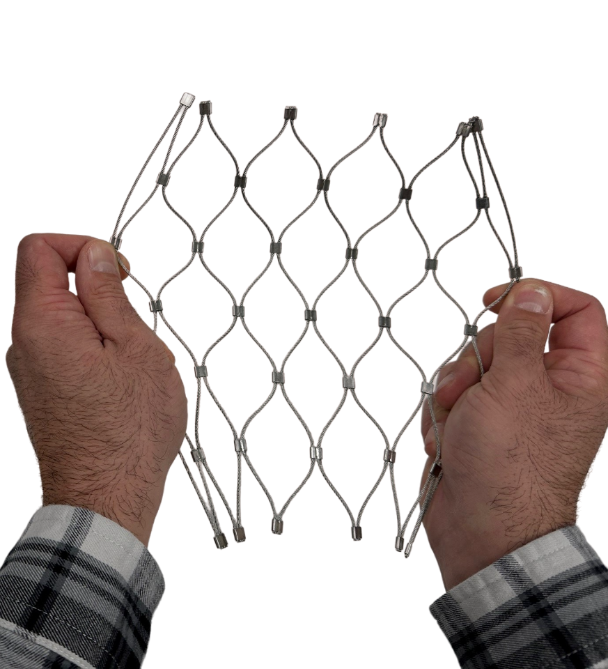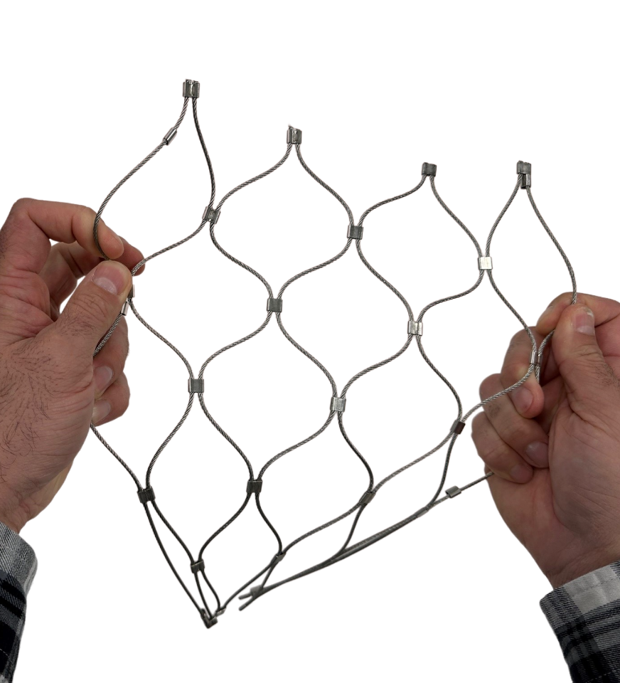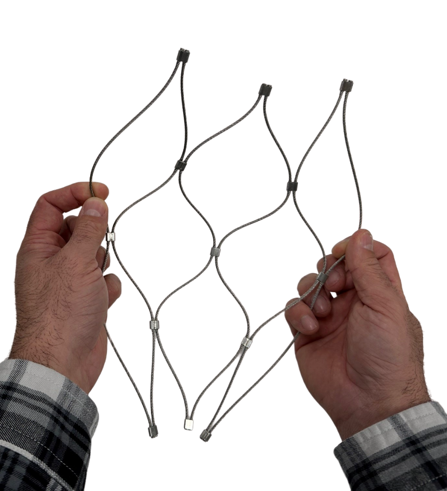 We offer samples of our standard cable mesh products in natural stainless steel, black and white. Samples are approximately 10”x10” when stretched to their ideal tension and recommended 60-degree angle.